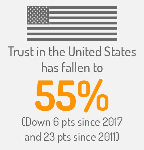 Trust in the US is well below trust in the UK (90%), Japan (87%), and France (85%), slightly behind India (59%), and at a similar level to China (52%). It is ahead of only Russia (28%) and North Korea (8%) among the eight nations polled on the trust question this year.