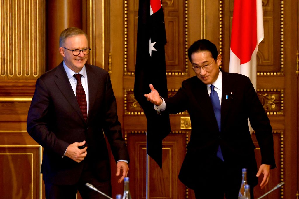 Australia’s Prime Minister Anthony Albanese (left) is escorted by Japan’s Prime Minister Fumio Kishida (Issei Kato via Getty Images)