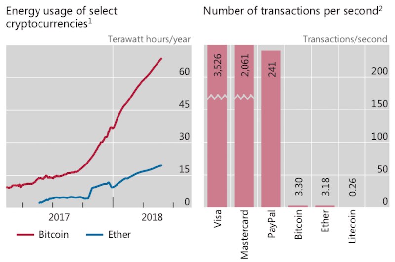 The cost of transactions is high. To put this in perspective, the electricity used by the specialised “mining” computers which carry out the transactions is equal to Switzerland’s entire electricity consumption. The BIS describes this as an “environmental disaster”.