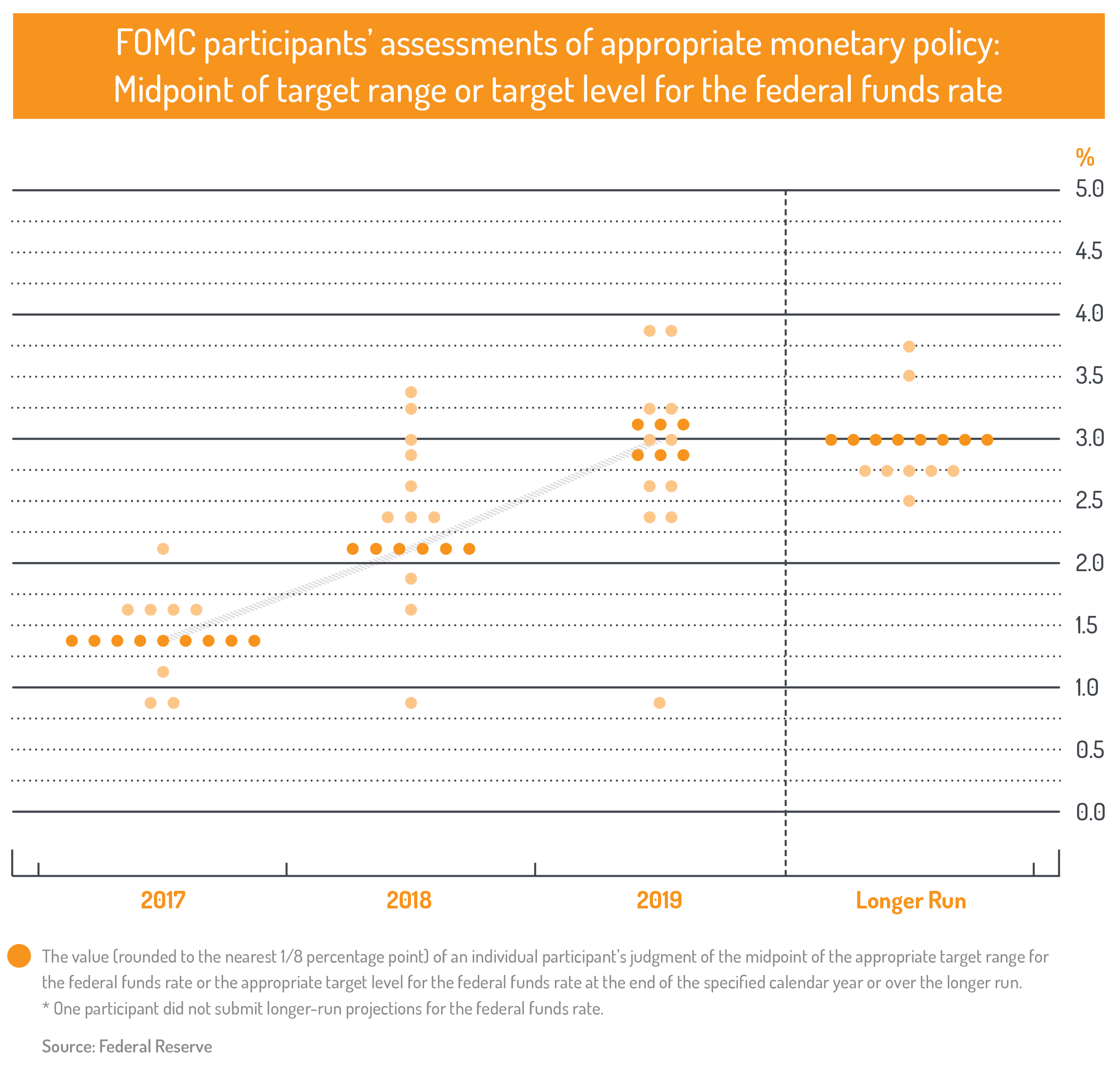 The decision on 15 March to move up by 25 basis points to 1% seems sensible. Any concerns focus on the projected path for further increases. The Fed board envisages two more 25 basis point increases this year (taking the Fed funds rate to 1.5%). Rates would be a bit over 2% by the end of 2018. On this leisurely schedule, by the end of 2019 the Fed funds rate will be back to the 3% historic norm. Here is the now-celebrated (at least in financial markets) ‘dot chart’ showing where individual Fed board members think rates should/will be in the future.