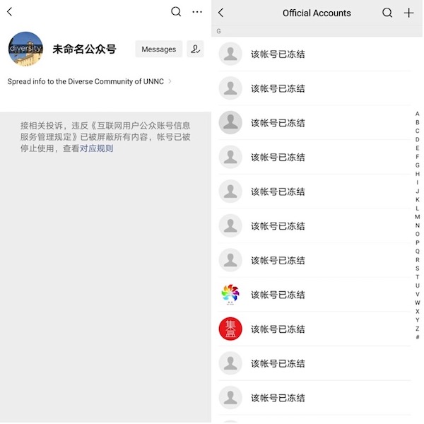 The screenshots below show an LGBTQ student society account disabled alongside a screenshots of other “frozen” social media accounts. In 2018 the company, pressured under cybersecurity laws in China, had made an attempt to remove LGBTQ content from Weibo, another popular social media platform. However, challenged by a social media campaign, the company backtracked on that decision. Tencent has not issued any explanation on why the decision to remove the WeChat accounts was taken.