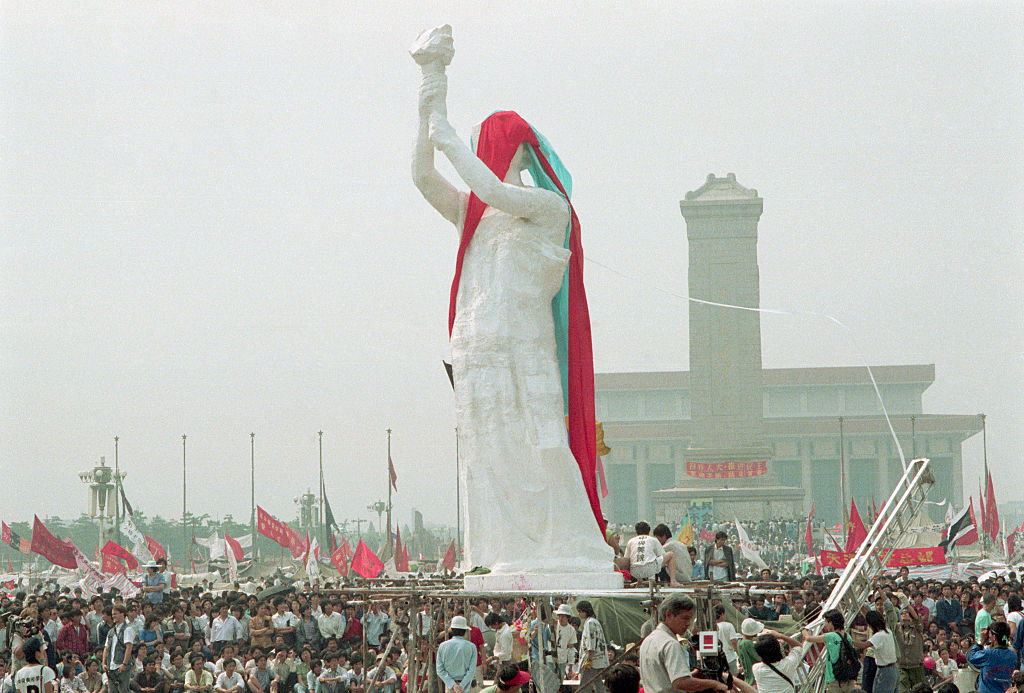 Protests began on 15 April 1989, prompted by the death of Hu Yaobang, a former general secretary of the Chinese Communist Party. Hu was a cautious communist reformer, forced to resign in 1987 because he refused to take a hard line against student protestors. Hu’s death and funeral brought students out onto Tiananmen Square to demand reform. The students were joined by other workers’ organisations and established a permanent presence on the Square. In late May, they erected a paper-mache statue to the “Goddess of Liberty”.