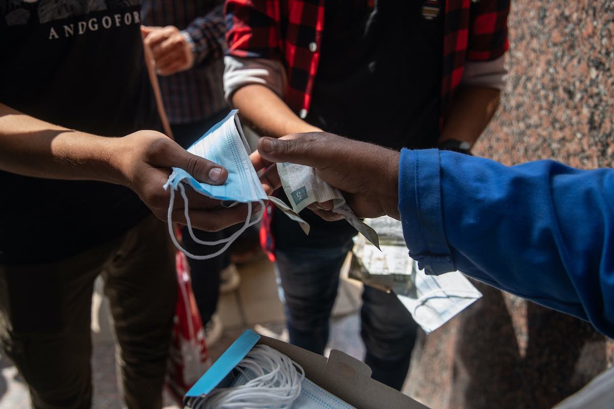 Selling masks at the entrance of Ramses railway station in Cairo, the new business for many street vendors (Roger Anis/IMF Photo)
