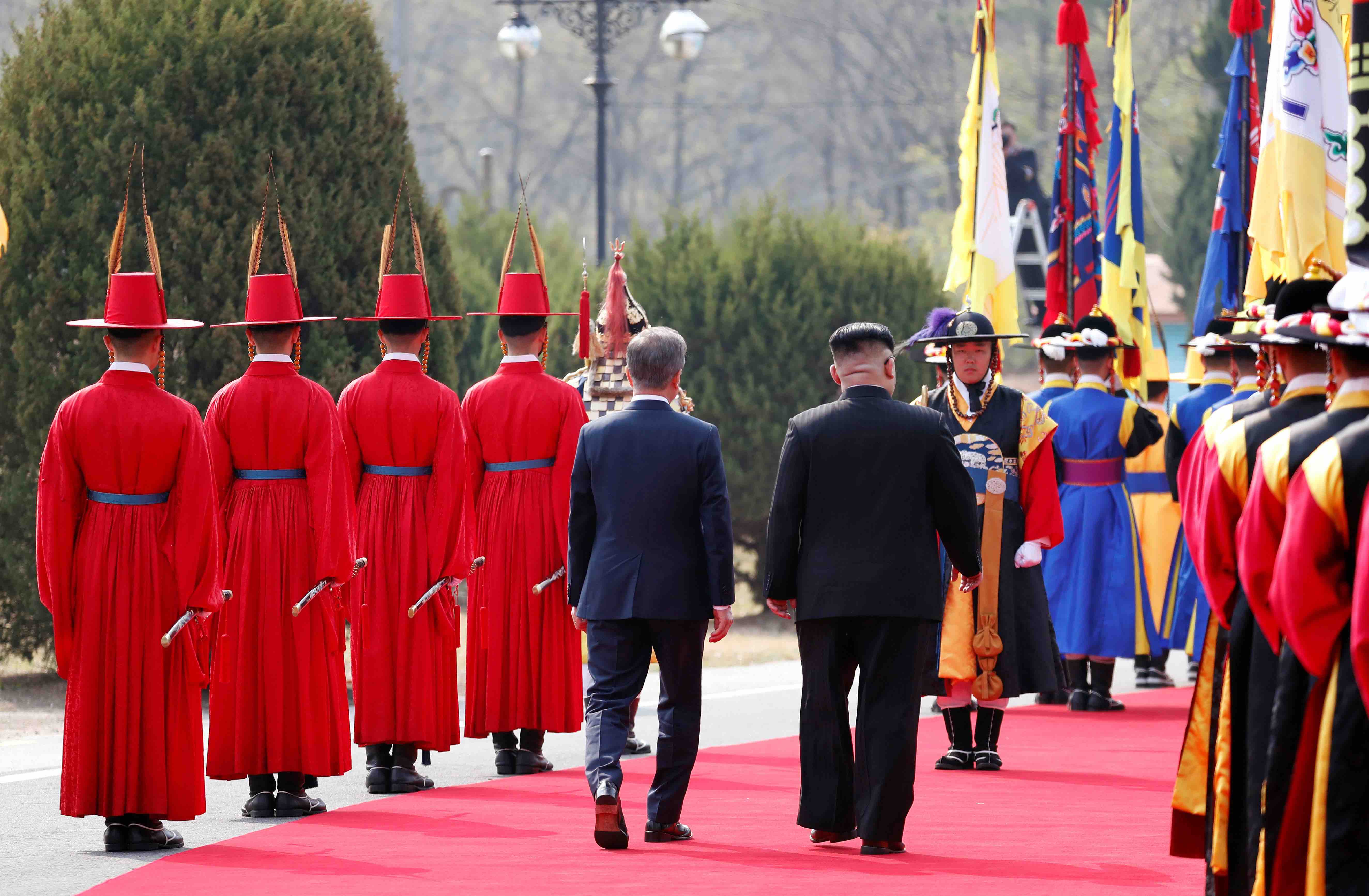 Moon wore a blue tie, the colour of the Korean Unification Flag, to greet Kim at the demarcation line. He also gave Kim a Joseon royal guards welcoming ceremony that was also used when Trump visited South Korea in November last year, elevating the North Korean leader to the same level of other heads of state.