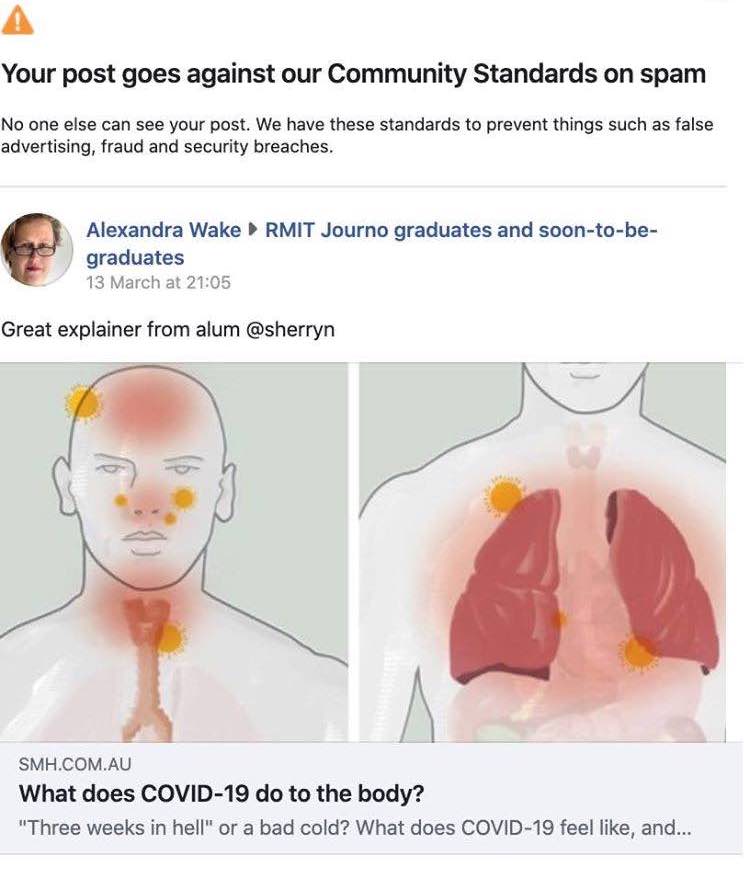 In the early days, Facebook initially bungled its takedown notice of all Covid-19 posts and cross-posts, removing posts linking to stories from trusted news sources, along with those from more dubious publishers. (I had personal experience of this, as shown.)