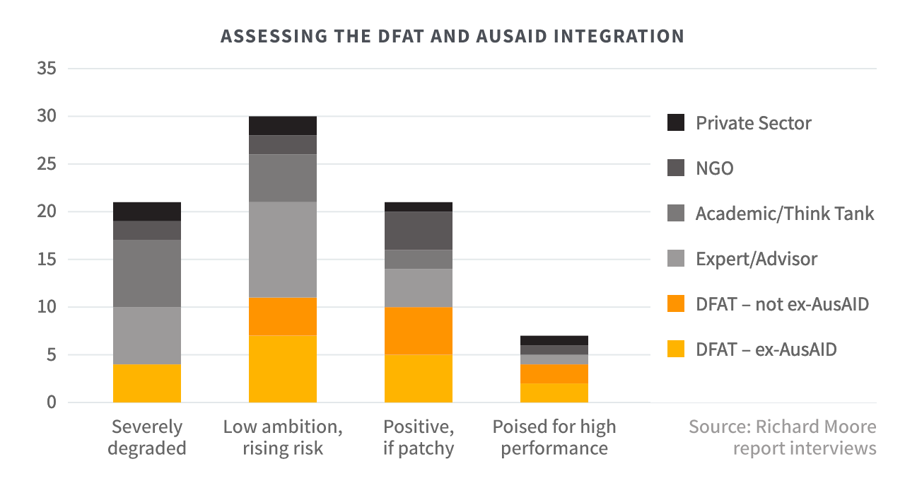 Moore argues the integration has proceeded relatively efficiently; that his interviews showed no sharp opinion divide between ex-AusAIDers and mainstream DFATers; and there are examples of development goals being more strongly advanced through joined-up, whole-of-department efforts.