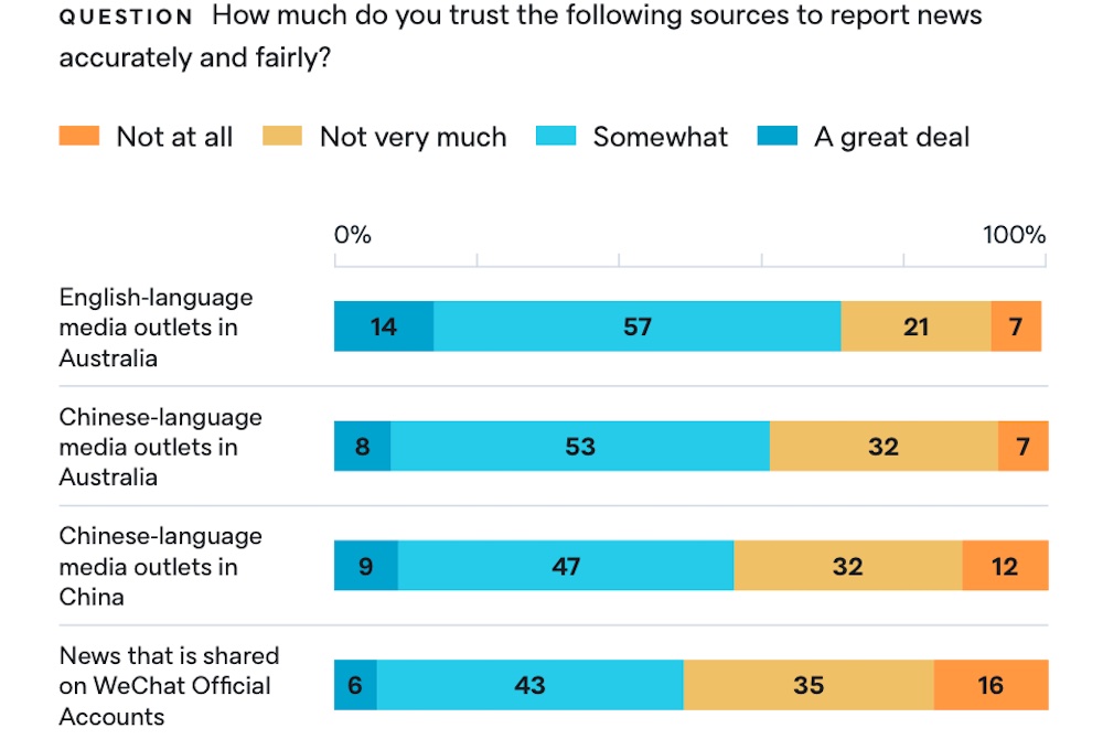 1. WeChat, the Chinese “super-app” that includes messaging, social media, financial payments and more, has attracted much debate in recent years. Most Chinese-Australians rely on the app for Chinese-language news (86%) and contact with friends and family (66%). But they are also sceptical of the reliability of news shared on the platform. More Chinese-Australians rate Australian media platforms as being fair and accurate (71%) than news shared on WeChat (49%). Nevertheless, the majority of Chinese-Australians (57%) say that Australia media coverage of China is “too negative”, an increase of seven points since 2020.