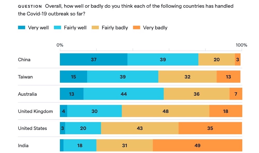 1. With differing international approaches to managing the Covid-19 pandemic, the majority of Chinese-Australians see countries aiming for Covid-zero as handling the pandemic well. Amid intense global speculation and outright disinformation, the survey also reveals significant uncertainty and divided opinions among the Chinese-Australian community as to the origins of the pandemic, with 31% saying they are unsure, 27% saying the virus originated in a lab leak in the United States, 15% saying a lab leak in China, and only 21% believe that the most likely cause of the Covid-19 pandemic was from human contact with an infected animal in China.