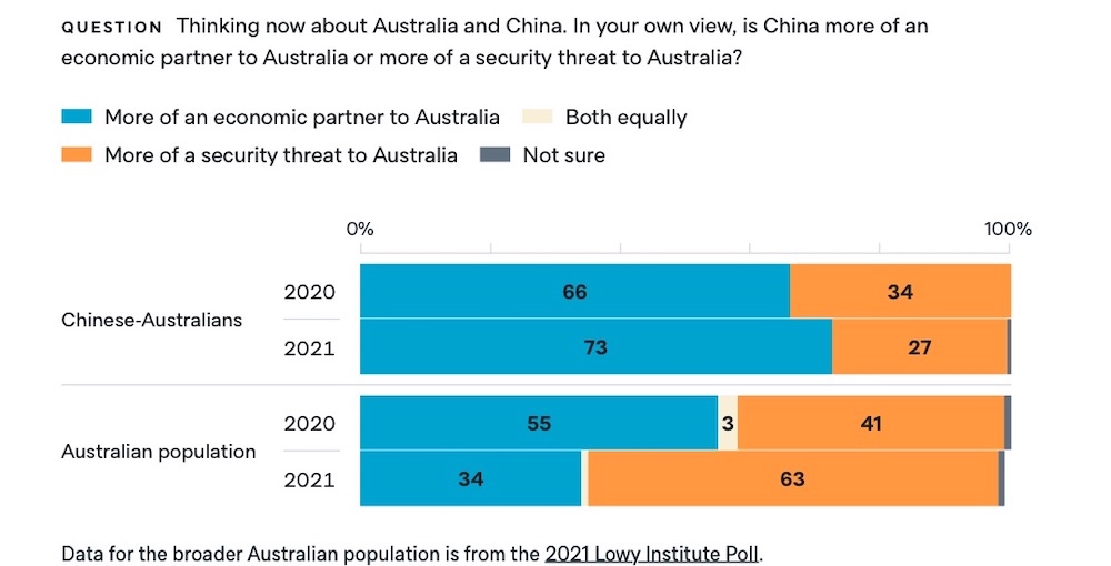 1. The majority of Chinese-Australians continue to see China as “more of an economic partner to Australia”, in contrast to the broader Australian population that see China as “more of a security threat”. Nevertheless, Chinese-Australians are less optimistic than other Australians about Australia’s position in great power competition, with only 53% saying it is possible for Australia to have a good relationship with China and United States at the same time. This view is held by 72% of the broader Australian population.