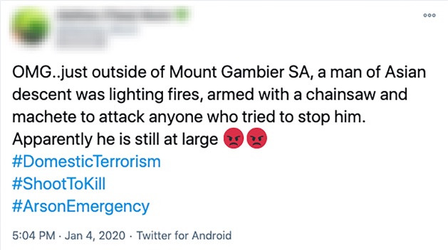 In this network I observed a worrying amount of problematic content that bumped up against, and in some cases went over, the margins of hate speech, racism and incitement to violence. The example above shows a tweet of an unsubstantiated claim that a “man of Asian descent” was lighting fires – notably, it includes the hashtags #DomesticTerrorism and #ShootToKill. This is an attempt to legitimise the use of violence against particular sub-groups, which fits alongside other baseless claims that other groups such as environmentalists and Muslims were conspiring to light bushfires on purpose.
