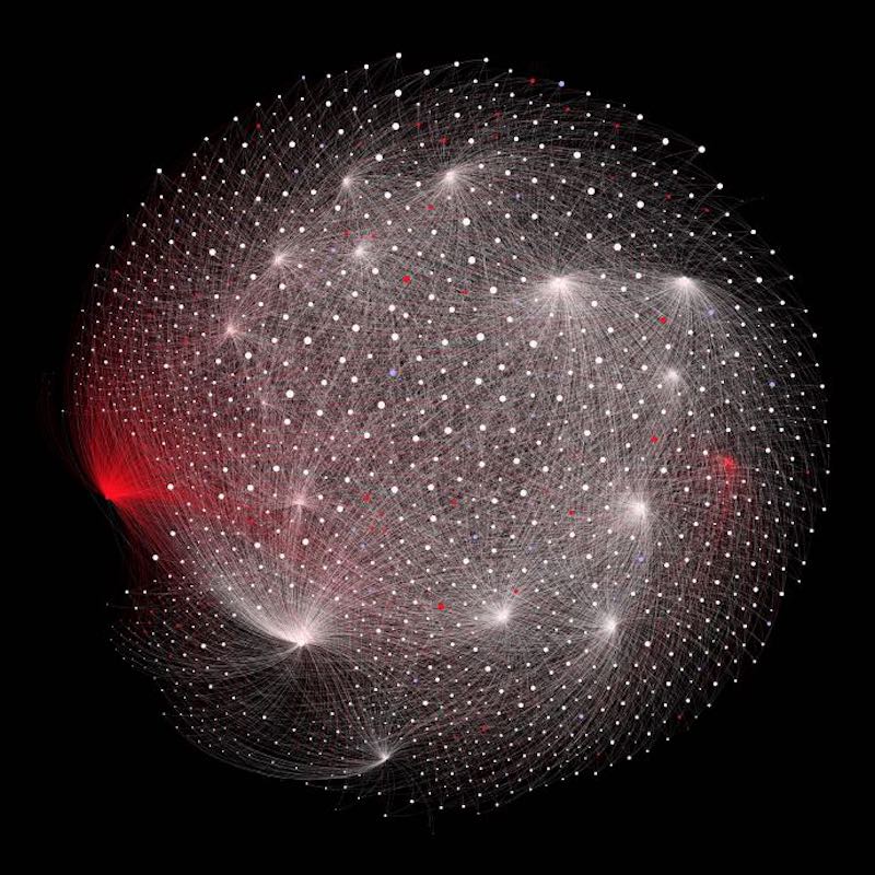 It is no surprise that Twitter has since suspended one in 20 prominent accounts in this #ArsonEmergency network. The figure below shows the follower network for these accounts, filtered to focus on the most prominent nodes (accounts with more than 20 in-links or “follows” from other accounts). Suspended accounts are shown in red (6% of total), deleted accounts are blue (5% of total), and active accounts are white (89%).