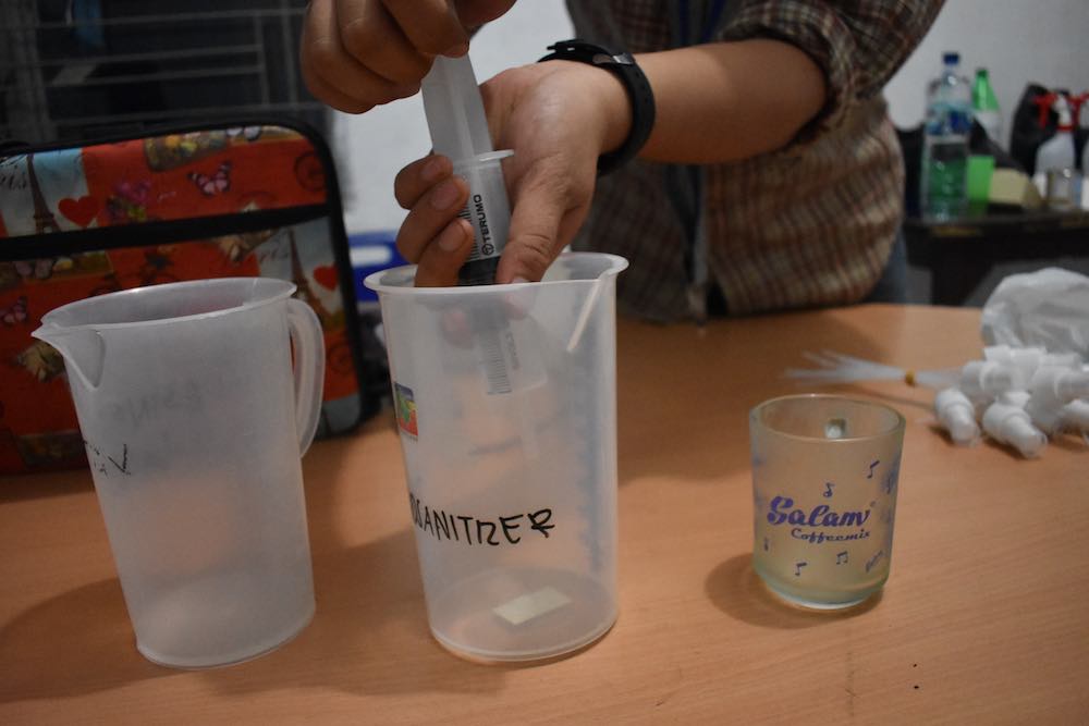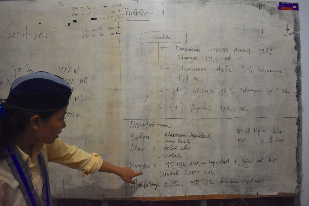 And while they may have started work quickly, their strategy is impressively well thought out. It’s not just about raising awareness about good hygiene. The students are worried that the price of the materials used to make the sanitiser will also increase in the coming months. It currently costs them IDR7,000 (0.43 cents) to make 100 millilitres of the sanitiser. “We wanted to show that it doesn’t have to be expensive,” says Gultom. “We hope the government is watching, so that they don’t let price gouging become a problem.”