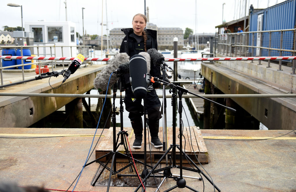 Climate change activist Greta Thunberg speaks at a press conference in Plymouth before setting sail for New York on 14 August (Photo: Finnbarr Webster/Getty)