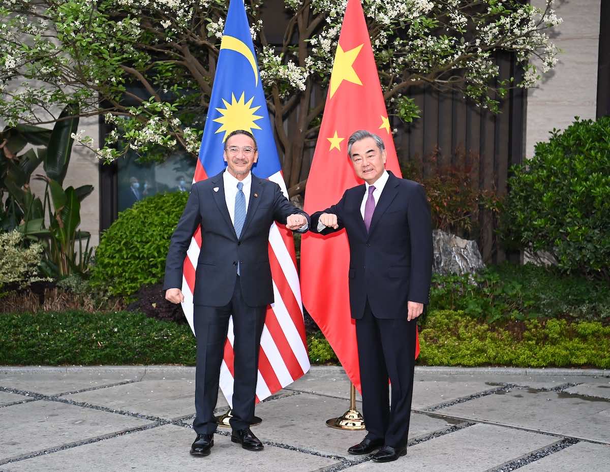 Malaysian Foreign Affairs Minister Hishammuddin Hussein (left) with his Chinese counterpart Wang Yi in Nanping, China, 1 April (Li Xiang/Xinhua via Getty)