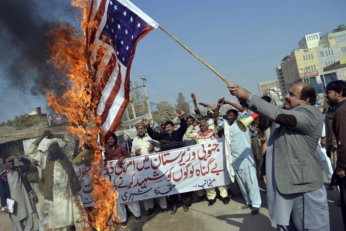 A Pakistani protester holds a burning US flag as they shout slogans during a protest in Multan on 24 January 2012 against US drone attacks in the Pakistani tribal region. The drone killed four militants in Pakistan’s Taliban and al-Qaeda hub of North Waziristan, security officials said (S. S. Mirza/AFP via Getty Images)