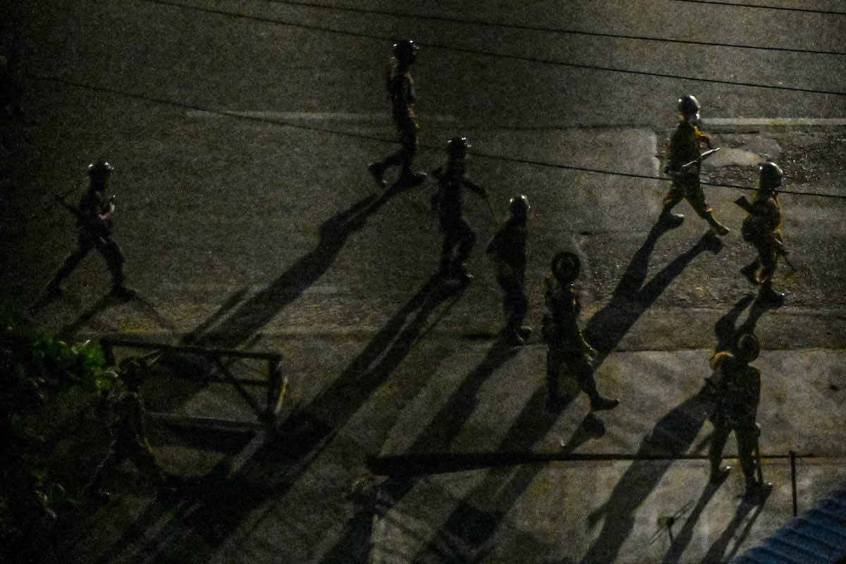 Soldiers patrolling along a street in Yangon in April (STR/AFP via Getty Images)