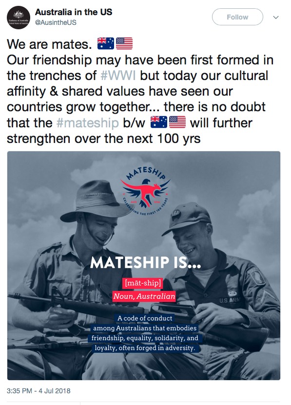 The Australian Embassy in Washington has been promoting “100 Years of Mateship” between Australia and the US in the lead-up to the centenary of the Battle of Hamel in the First World War, which has been commemorated this week.