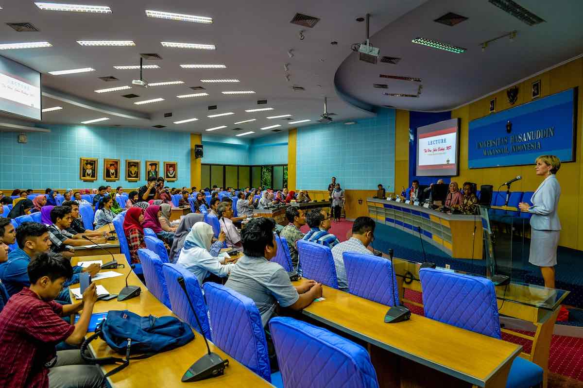 Julie Bishop, as foreign minister, presenting a lecture to students of Hasanuddin University, Makassar, Indonesia (Timothy Tobing/Australian Embassy Jakarta/Flickr)
