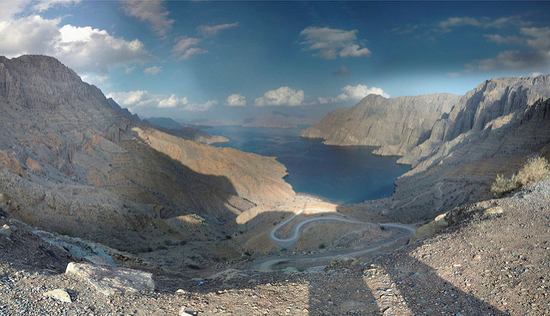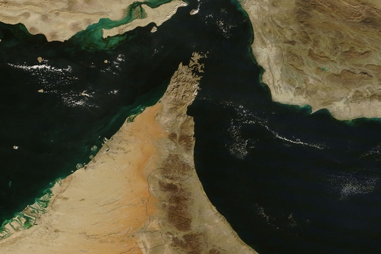 Sparsely populated, remote and economically underdeveloped, the exclave of Musandam is one of eleven governorates of the Sultanate of Oman. The Musandam peninsula juts into the Strait of Hormuz that separates the Sea of Oman (on the right in the 2008 photograph below from NASA) from the Persian Gulf (on the left).