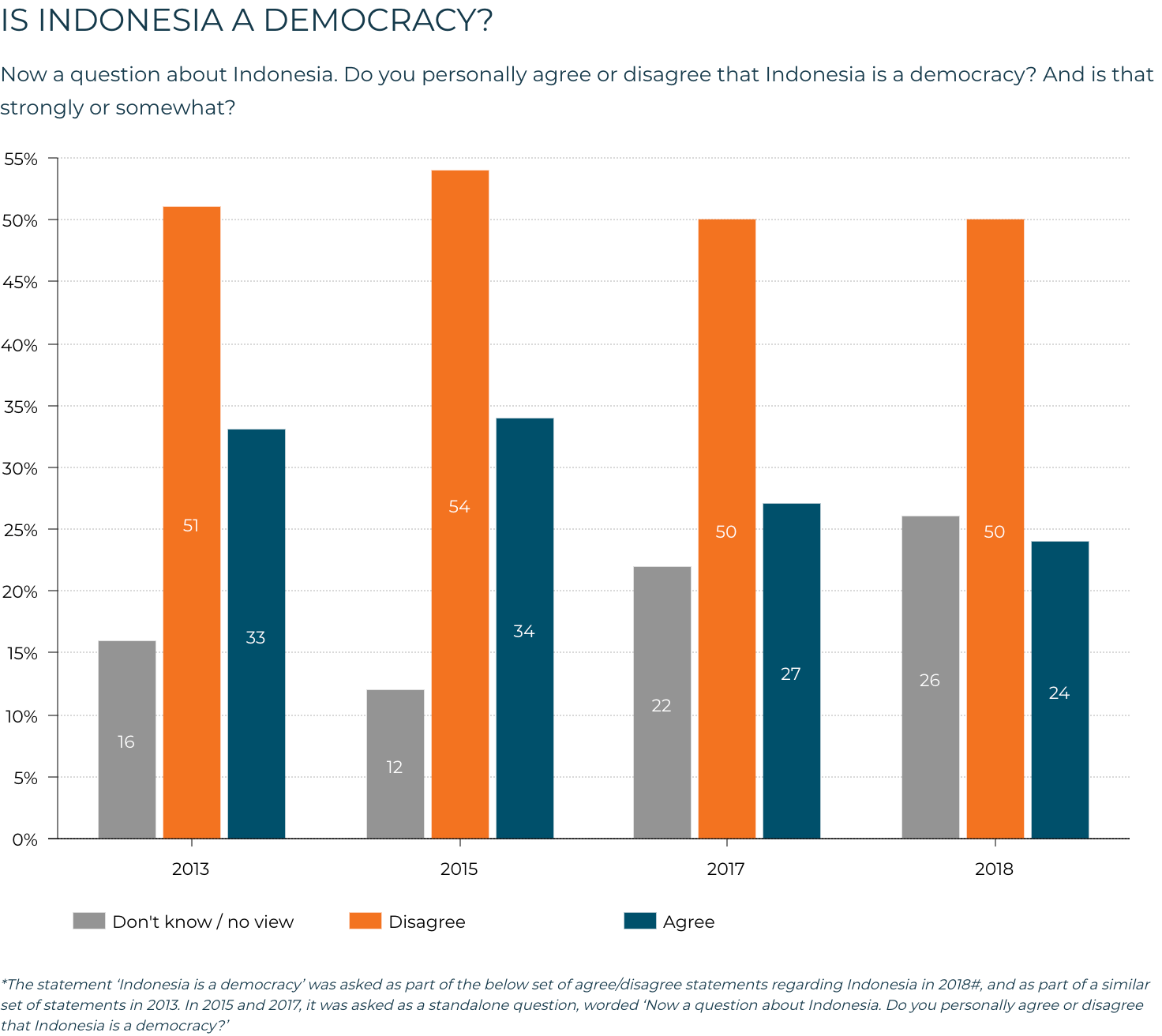 A lack of knowledge on basic facts contributes to these misperceptions. For example, as a Lowy Institute survey found, most Australians are not aware that Indonesia is a democracy. Since 2015, the number of people surveyed who correctly answered that Indonesia is a democracy has dropped by 10%.