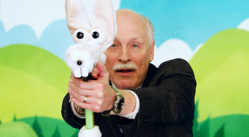 Gun activist Philip Van Cleave wields the “puppy pistol” in episode one of Sacha Baron Cohen’s Who is America? (Photo: Stan)