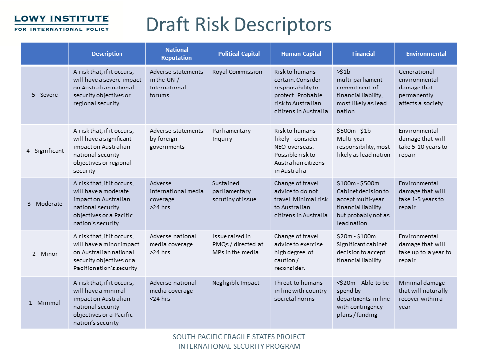 Second, it must be noted that the risks, and costs, of both intervention and declining to intervene are not just financial. The risk descriptors outlined below are an attempt to articulate the impact of that risk to the Australian government across five categories: national reputation; political capital; human capital; financial cost; and environmental impact.