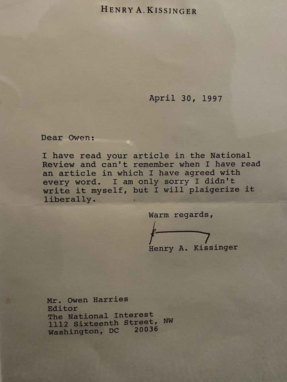 A few years ago, Owen donated to the Lowy Institute two letters of congratulation he had received from foreign-policy luminaries. We display them both in our headquarters at 31 Bligh Street. The first was from the father of containment, George F. Kennan. The second was a charming letter dated 30 April 1997 from the most famous realist of all, Henry Kissinger. “I have read your article in the National Review and can’t remember when I have read an article in which I have agreed with every word,” wrote Kissinger. “I am only sorry I didn’t write it myself, but I will plagiarise it liberally.”