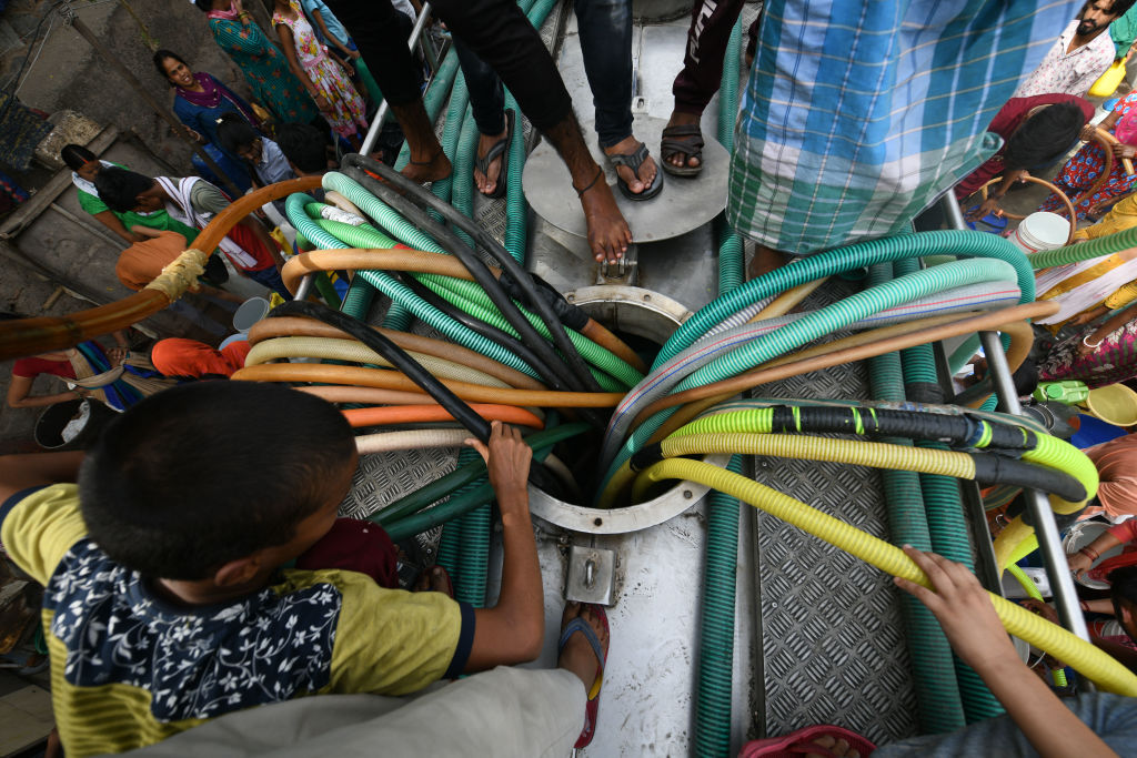 Collecting drinking water from a tanker amid soaring tempreatures at Sanjay Camp Chanakyapuri, New Delhi, 20 May (Sonu Mehta/Hindustan Times via Getty Images)