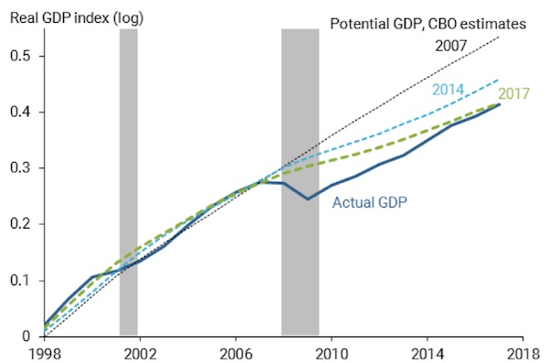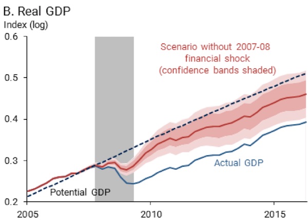 Just why this is so is a matter of debate, but researchers at the Federal Reserve Bank of San Francisco (FRBSF) have offered an estimate that without the abnormal severity of the 2008 crisis, American GDP would be 7% higher than it is. Ouch!